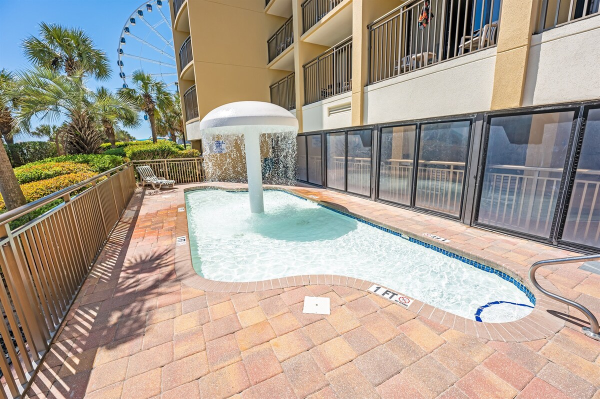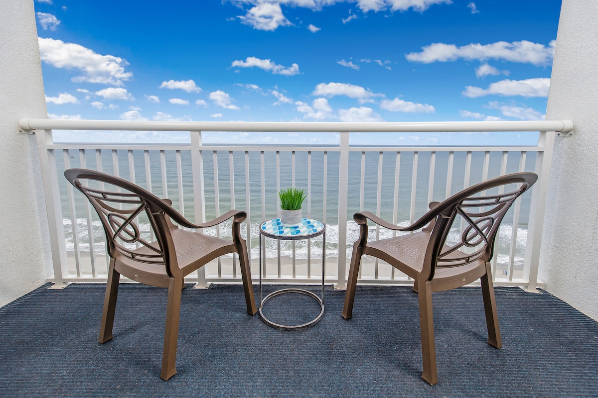 Enjoy Ocean Views from Private Balcony - Keurig K-pod and Drip coffee Makers - Comfortable Bedroom: Two cozy queen-sized beds. - Sleeper Sofa: In the living room. - Fully Equipped Kitchen - 55" Smart TV in Living room and Bedroom Resort Amenities: - Indoor/outdoor pools - Hot tubs - Lazy river. - Fitness Center: - Free Wi-Fi - Stay Connected - Direct Beach Access - On-site attached parking available. - Central Location: - Close to Myrtle Beach Boardwalk, SkyWheel, and local attractions.