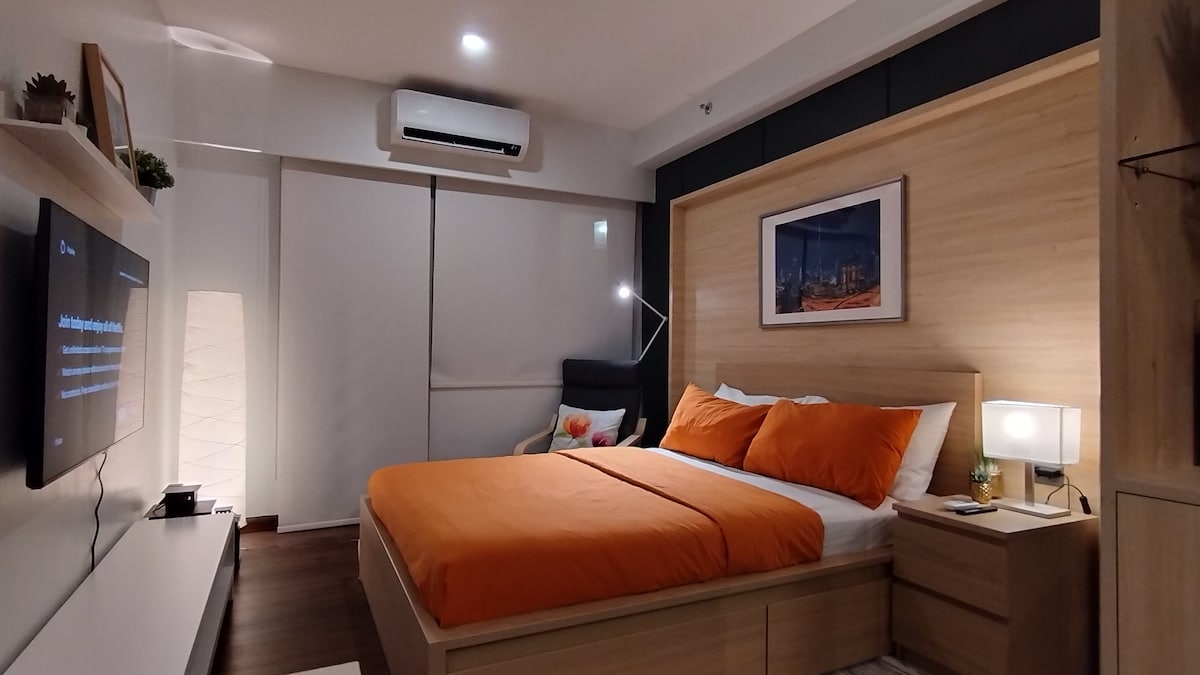 Welcome to our minimalist-designed 1 bedroom unit with an amazing pool view. Relax in the airy living area with our smart TV, cook your meals in our fully-equipped kitchen to dine-in or simply enjoy moments looking out the balcony. But most importantly, sleep soundly in our comfortable beds. Located at walking distance to Ikea, SMX Convention Center, MOA Arena and those surrounding the Mall of Asia area. Indulge in the nearby restaurants, cafes and convenient stores just outside the condo.
