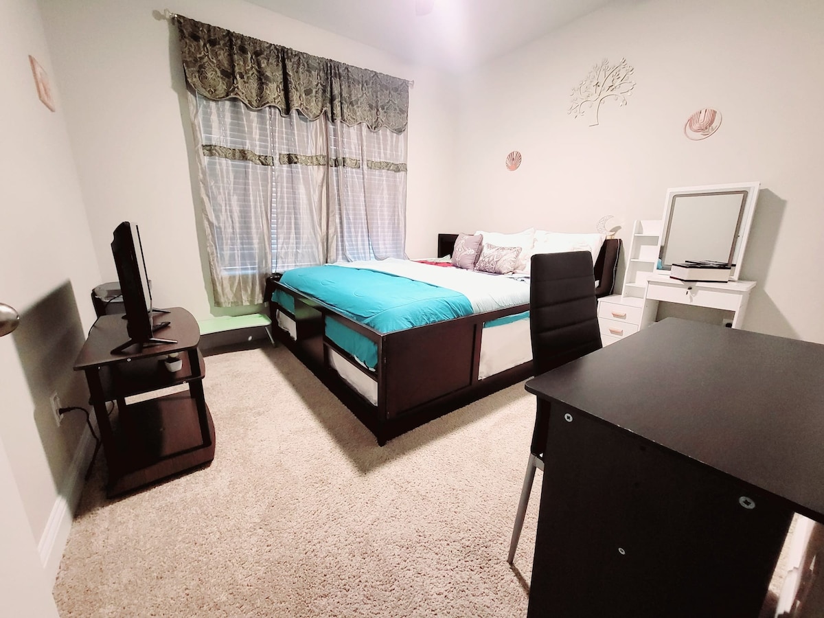 Hello our pretty peacock themed room has a queen size bed with extra pillows/blankets, TV with Roku, Xfinity stream, fast WIFI, large mini fridge, UV-C air sanitizers, walk in closet, dresser, armoire, keyless locks and tons of other extras! Access to attached 1/2 bath downstairs, full bath upstairs and washer/dryer access. Free self serve breakfast of coffees, teas, hot/cold cereals, bagels, fruit. Bottled water in room and snacks available. No curfew after checkin.