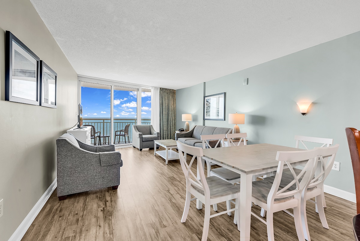 대서양, 해변 및 도시 스카이라인의 놀라운 전망을 감상할 수 있는 바닥에서 천장까지 이어지는 유리 벽이 있는 아름답게 꾸며진 바다 전망 콘도입니다. 발코니에서 휴식을 취하거나, 침대에서 일출이나 일몰을 감상하거나, 해변을 산책하거나, 수영장, 온수 욕조, 게으른 강, 벽난로를 즐겨보세요. 새로운 2번가 부두, 레스토랑, 편의점, 수상 스포츠/공원, 패밀리 킹덤에서 도보로 단 몇 분 거리에 있습니다. 반려동물 동반 불가! 체크인하려면 만 21세 이상이어야 합니다.