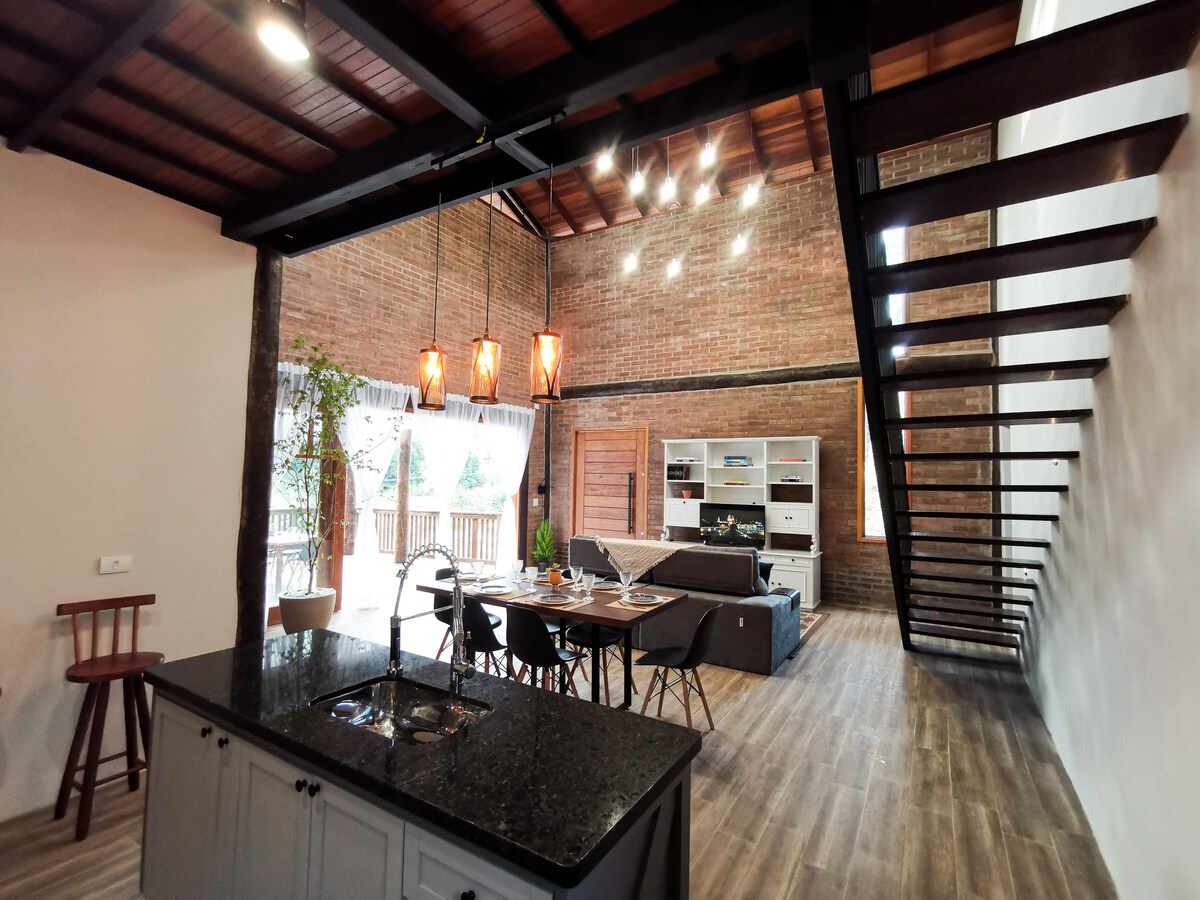 자연 한가운데에 있는 로맨틱한 휴양지로 커플에게 이상적입니다. 커피 농장으로 둘러싸인 목장에 위치한 스위스 스타일의 샬레(A자형 주택)로, 전용 강과 폭포가 있습니다. 세하 다 만티케이라가 내려다보이는 야외 욕조, 실내 자쿠지, 화덕, 바비큐 시설, 비치 테니스 코트, 그네 침대, 전망이 좋은 드라이 사우나, 100인치 스크린이 있는 실내 프로젝터가 있습니다.