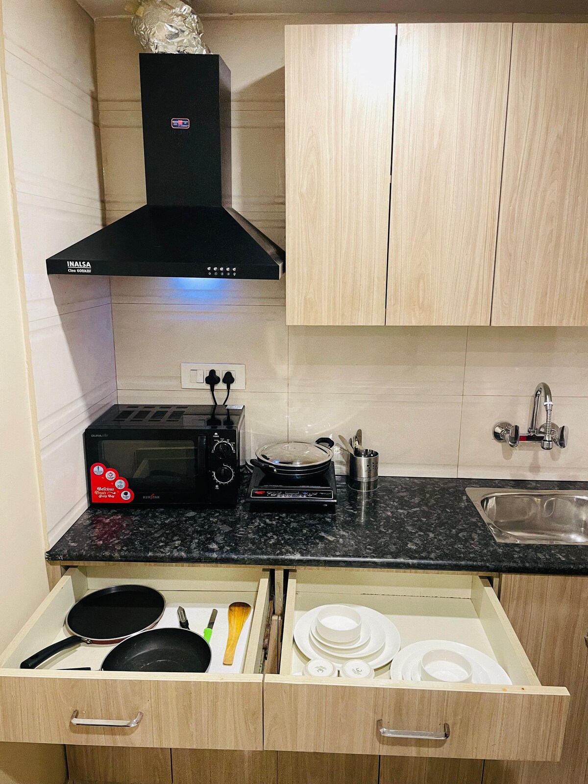 거실과 침실에 에어컨이 구비된 구르가온 섹터 43의 프리미엄 1BHK 서비스 아파트, 인덕션, 전자레인지, 식기류가 구비된 간이 주방. 골드 수크 몰 및 샬롬 힐스 학교까지 도보로 갈 수 있는 고급 지역에 위치하고 있으며, 밀레니엄 시티 센터 지하철에서 2.2km, 포티스 병원에서 2.1km 거리에 있습니다. 외국인 게스트 환영합니다. 얼리 체크인은 이용 가능 여부에 따라 달라질 수 있으며, 500루피가 부과되며, 레이트 체크아웃도 이후 3시간마다 500루피가 추가됩니다.