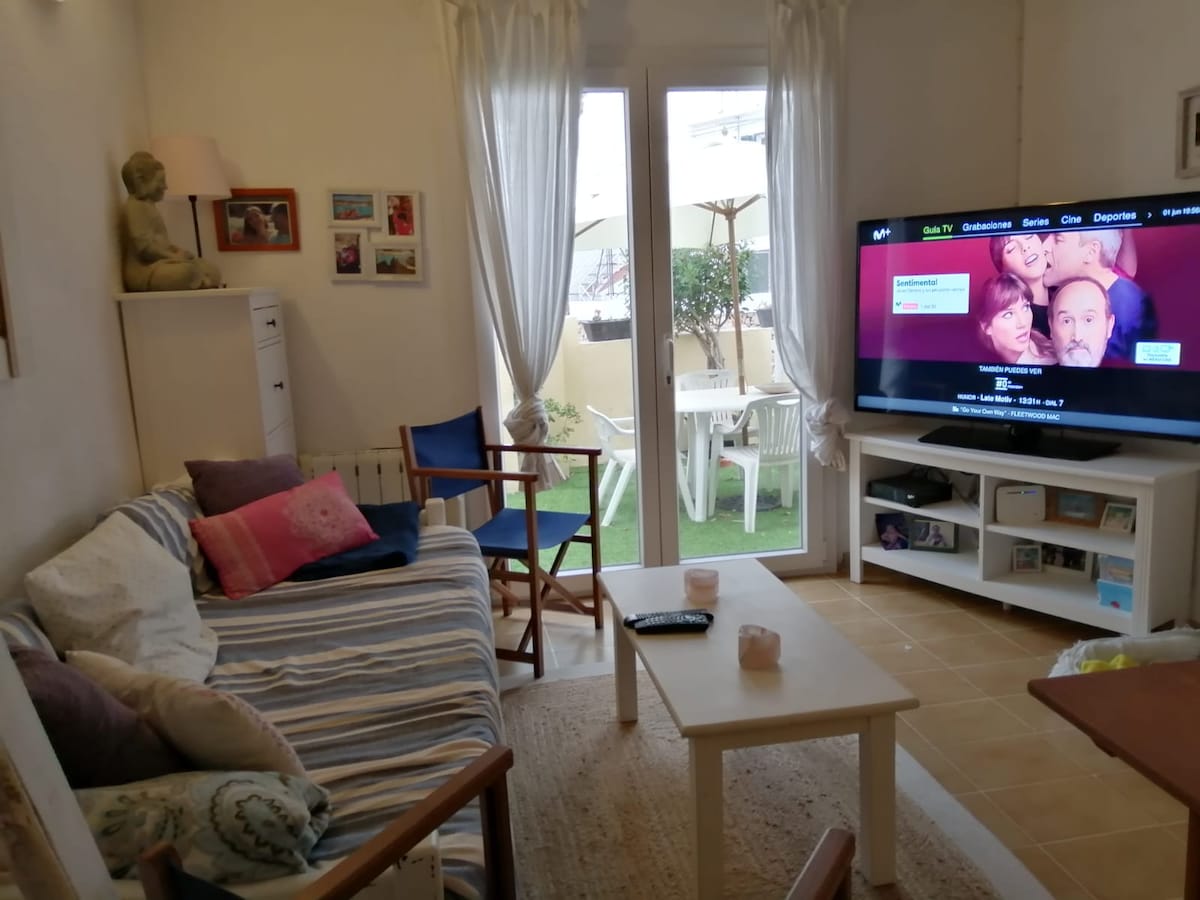Se alquila casa individual en planta baja, sin vecinos encima, con patio interior. Comedor con aire acondicionado y gran televisor con acceso al patio de unos 20m cuadrados con mesa y sillas. Cocina totalmente equipada con lavavajillas y cafetera eléctrica. Un baño con una gran bañera y secador. Tres habitaciones, una habitación con cama de matrimonio y ventilador de techo, una con dos camas individuales y ventilador de techo y una con cama individual. Lavadero equipado con lavadora y secadora.