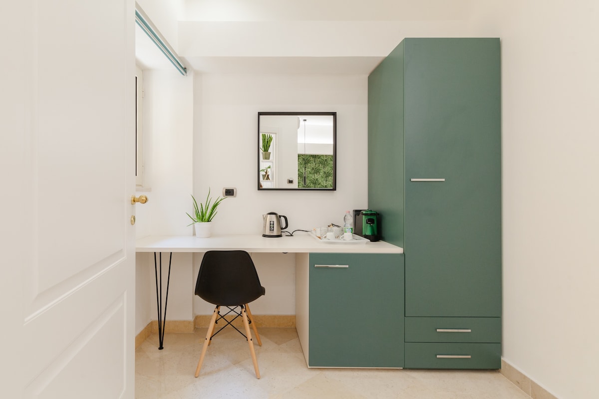Giulia Suite offers a queen size bed and a private bathroom for comfort and privacy. Enjoy the balcony with a view of Positano. Equipped with a smart TV and air conditioning, the room ensures entertainment and a pleasant atmosphere. A mini-fridge is available for convenience, and fresh towels are provided daily.