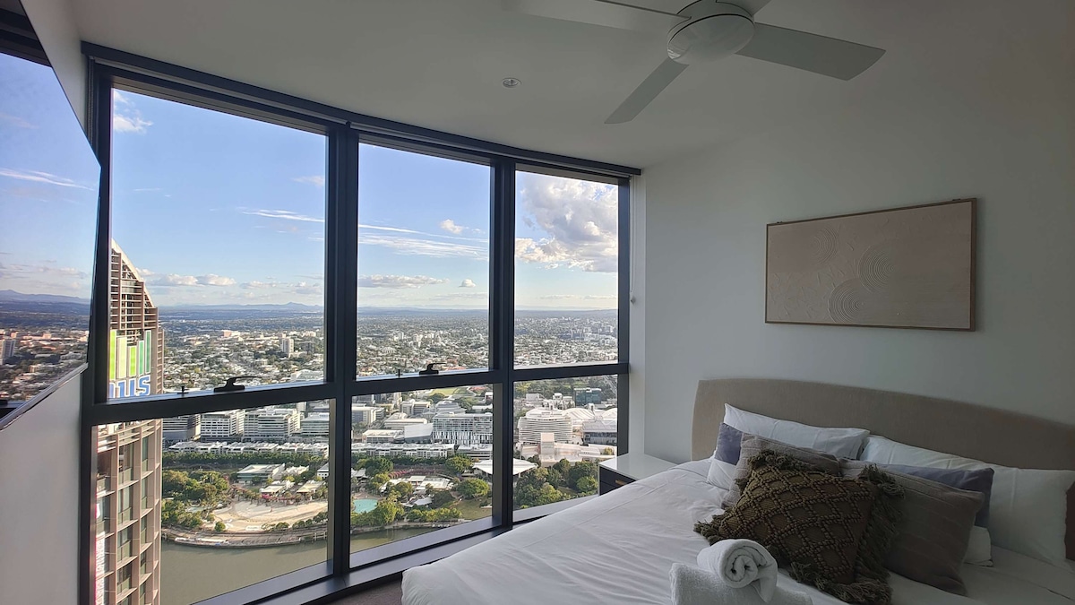 세련된 단지에 위치한 중심부에 위치한 2베드 숙소에서 환상적인 도시 전망을 감상할 수 있습니다. 편안함을 위해 대형 스마트 TV와 암막 커튼이 있는 킹사이즈 침대가 있는 메인 침실입니다. 싱글 침대가 있는 서재. 숙소 전체에 중앙 덕트형 에어컨이 설치되어 있습니다. 강과 도시의 멋진 전망을 감상할 수 있는 발코니로 연결되는 편안한 거실 공간. 라운지와 풀사이즈 주방에 스마트 TV. 지정된 안전한 주차장이 있으며 활기찬 사우스 브리즈번의 모든 관광지까지 도보로 가까운 거리에 있습니다.