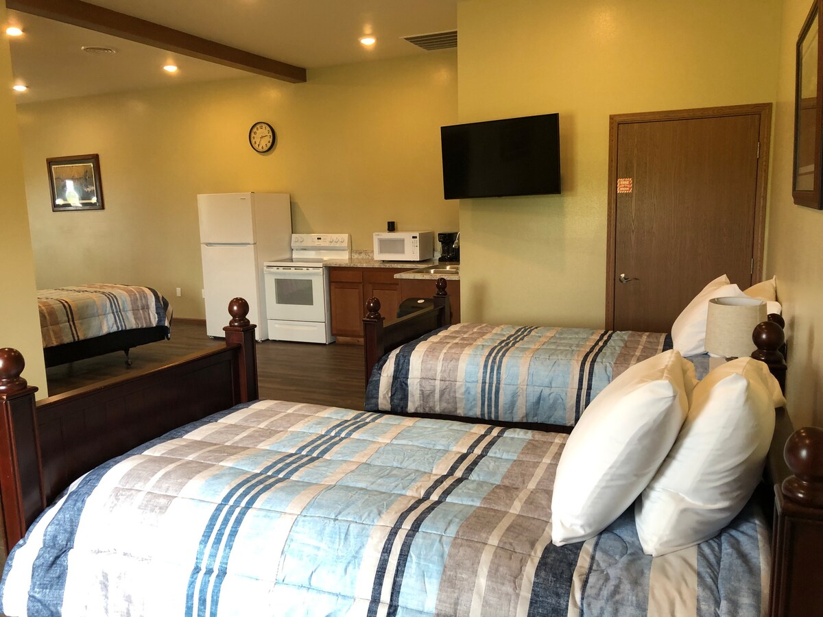 Stay in the center of the action in this one-of-a-kind place, with some of the best fishing and hunting in the state within just a short drive away in all directions! This unit is one of 4 units located within the Roslyn Mini Mall, along with Schmidt’ Custom Meats (a custom meat shop and grocery store) and Community Oil (a tire/ vehicle repair and maintenance shop). This room is a “hotel style” room that includes 1 queen and 4 twin beds and a kitchenette, private bathroom/shower.