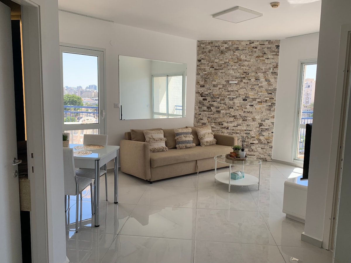 아름답게 개조되고 넓은 2베드룸 아파트로 에일랏 중심부에 편리하게 위치하고 있으며 해변, 쇼핑몰 및 바까지 도보로 15분 거리에 있습니다. 이 아파트는 내 집처럼 편안한 숙소에 머무는 동안 시설이 완비된 주방과 가전제품으로 멋지게 꾸며져 있습니다. 탁 트인 바다와 산 전망을 감상할 수 있는 넓은 발코니에서 멋진 석양을 즐겨보세요. 저희 숙소에서 회원님을 호스팅하게 되어 기쁩니다!