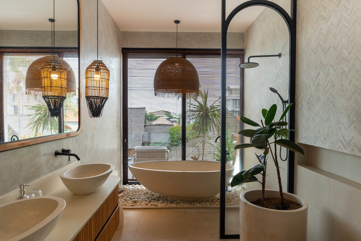 Brand new modern, spacious, clean. Constructed in January 2024. 3-bedroom villas situated just 2 minutes from the ocean, nestled in the vibrant heart of Canggu. These villas are conveniently close to a variety of supermarkets, top-rated restaurants, gyms, and the exquisite surf spot of Canggu. Offering the best location in Canggu, perfectly positioned between Batu Bolong and Berawa. - Spacious, sunken living room - Private pool and garden - Bathtub - High-speed Wi-Fi - Rooftop with ocean view