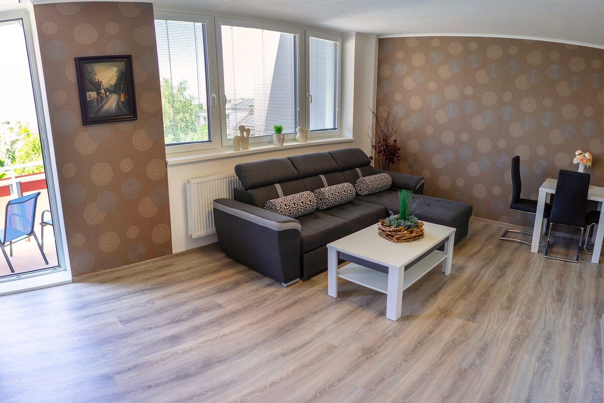 Krásný apartmán 110 m2 v klidném vnitrobloku a těsné blízkosti centra. Jedno parkovací stání před domem. Dvě ložnice s luxusními Boxspring postelemi, TV a sedačkami pro plnohodnotné spaní. Plně vybavená kuchyň se vstupem na krytou terasu s venkovním posezením pro 6 osob, grilem a výhledem na Svatý Kopeček. Balkón s posezením pro 2 osoby. Šatna, WC, koupelna s walk-in sprchovým koutem. Uzamykatelná kolárna v přízemí. Obchody, restaurace, pekárnu, koupaliště atd.přímo v ulici ubytování.