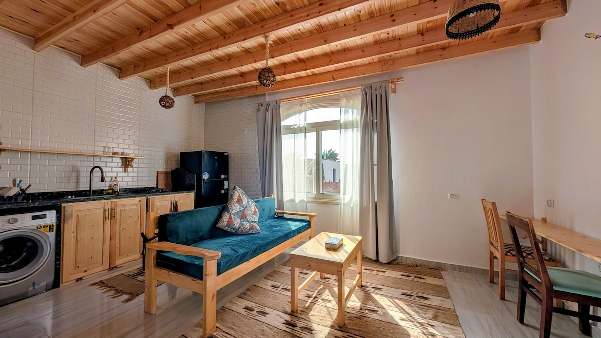 다하브에 있는 아늑한 숙소에 오신 것을 환영합니다! 1층에 위치한 '바다'를 통해 들어가는 아파트에서는 사진과 같이 야자나무 가지와 햇살을 통해 아름다운 바다 전망을 감상할 수 있습니다. 이 넓은 침실 1개의 아파트는 우리가 사랑하는 다합의 유기농 자연 라이프스타일을 반영하는 수제 가구와 액세서리로 가득합니다. 해변 바로 옆 2번째 줄에 위치해 있으며, 아살라 시장까지 도보로 단 3분, 등대까지 도보로 10분 거리에 있습니다.