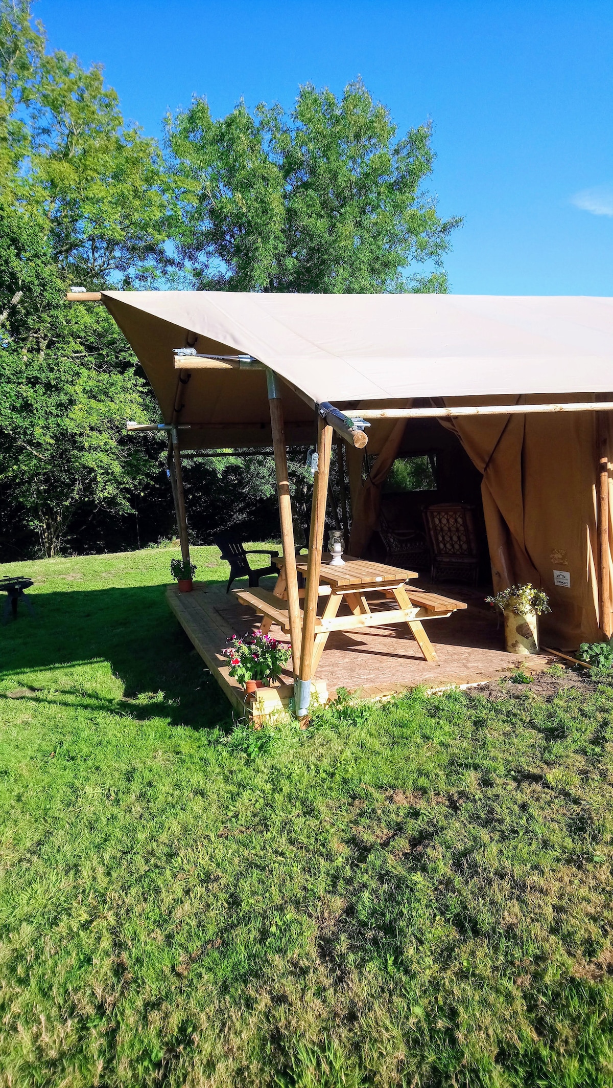 탱글우드는 오래된 숲에 인접한 개인 환경에 위치한 멋진 사파리 텐트입니다. 텐트는 매우 편안하며 일상적인 압박에서 벗어난 이상적인 휴양지입니다. 유일한 이웃은 현지 야생동물입니다. 평화롭고 조용한 곳을 찾고 계신다면 이곳이 완벽합니다. 즐거운 숙박을 위해 텐트에 시설이 완비되어 있습니다. 바비큐 또는 가스 호브 및 오븐으로 요리. 쌀쌀한 밤을 위한 가스 히터 및 온수 보온병 내부 화장실 및 손 세면대 외부 가스 샤워 전기 없음 반려견 동반 가능