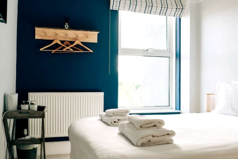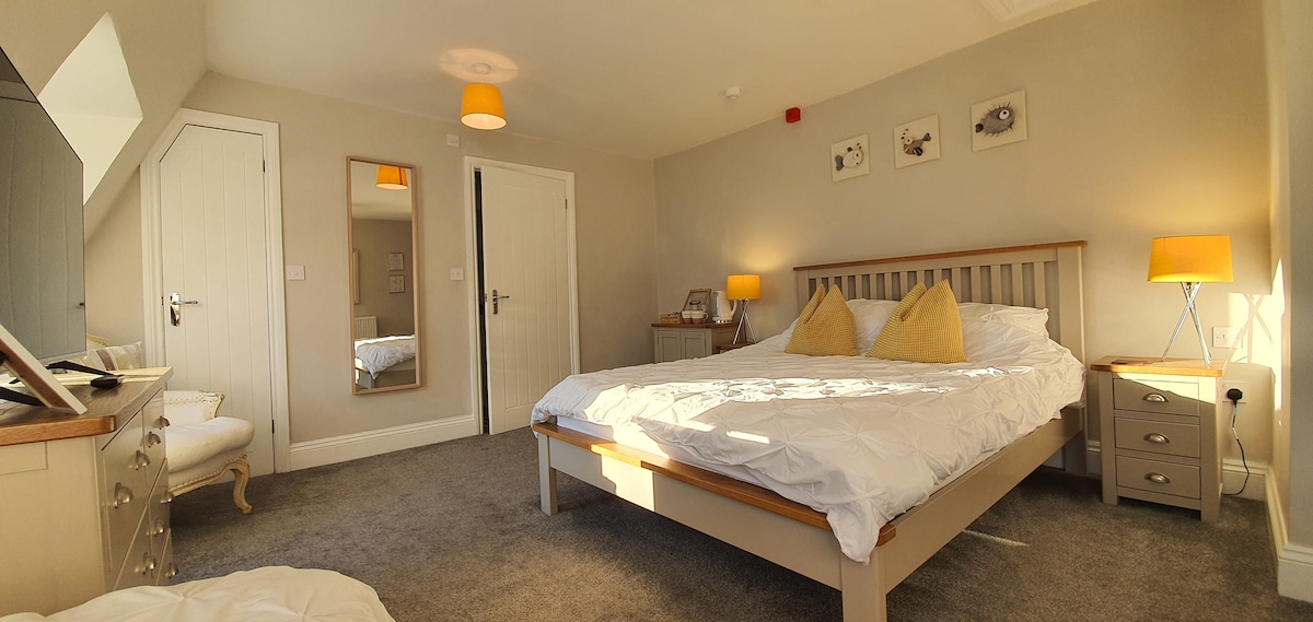 Our only non ensuite room located just off the first floor stairs. It has its own private bathroom directly opposite with a shower, toilet and sink. It is chic and cosy with a coastal colour theme. Continental or cooked breakfast is available at £15 per person/day. Dogs are £15 per stay.