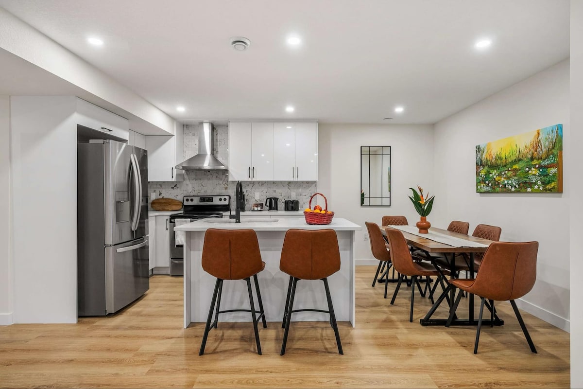 이 현대적인 침실 1개 유닛에는 전용 출입구, 완비된 주방, 침실에 딸린 세탁실, 새로운 퀸사이즈 침대, 소파 베드가 있습니다. 얼리 체크인, 셀프 체크인, 초고속 와이파이, 케이블 TV, 넷플릭스, 디즈니, 프라임 비디오 스트리밍을 즐겨보세요. 노상 주차장과 전용 파티오가 포함되어 있습니다. 사우스 헬스 캠퍼스, 세톤 상점, YMCA, 시네플렉스 근처에 편리하게 위치하고 있습니다. 시내로 향하든, 스프루스 메도우(10분 거리)를 방문하든, 산으로 당일 여행을 계획하든, 이곳은 캘거리 숙박을 위한 완벽한 장소입니다.