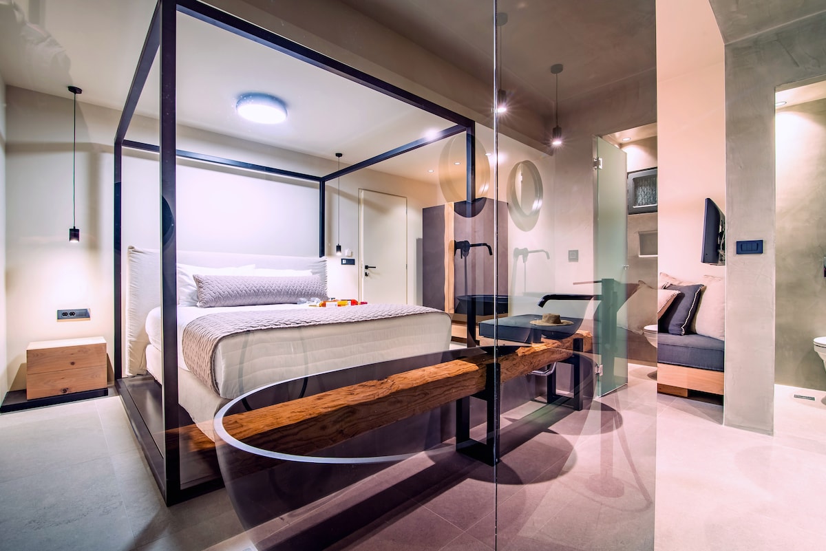 이 고급 스위트는 킹사이즈 침대와 넓은 거실이 있는 개방형 침실, 레인 샤워기가 있는 욕실, 작은 냉장고가 있는 완비된 간이 주방으로 구성되어 있습니다. 이 세련된 장식의 아파트는 아름다운 주변 환경에서 휴식을 취하고자 하는 최대 4명까지 수용할 수 있으며, 칼데라와 바다 전망을 모두 제공하는 온수 동굴 미니 수영장이 있는 감각적인 전용 테라스로 연결됩니다.
