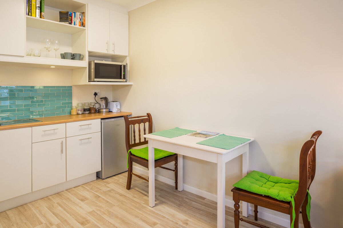 A cosy hideaway with a private entrance, fast WiFi and books, set in a tranquil, lush garden. A bistro table and chairs overlook the pool. The bedroom features a TV with access to Netflix, Disney+, Showmax, and DStv, a workstation equipped with a large desk and office chair, and a compact en-suite bathroom with a great shower. The kitchenette features a small fridge, microwave, egg boiler, toaster, coffee plunger, kitchen essentials, and some breakfast goodies. Our two dogs love guests!