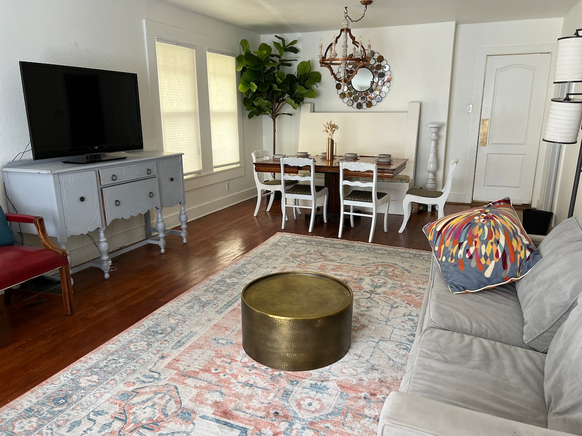 Top 1% _WORLD, Gr8 for Moody Center(1.1mi). High-Frequency Bus, IT'S CLOSER THAN THE UBER DROP-OFF. Easy Self Check-In with a key code. Privacy & 5STAR AMENITIES. Cable/Netflix, Dolby Atmos Sound, Bidet, Fireplaces, endless hot water, Wifi & Wired. Free parking, less than $10 uber to downtown. Eco-Friendly, Healthy stay, with Dyson, Vitamix, Frame TV, and Kitchenaid. Enjoy the historic wood floor under your bare feet in a charming Solar-Powered 1930s bungalow under a 100yr old Pecan Tree.