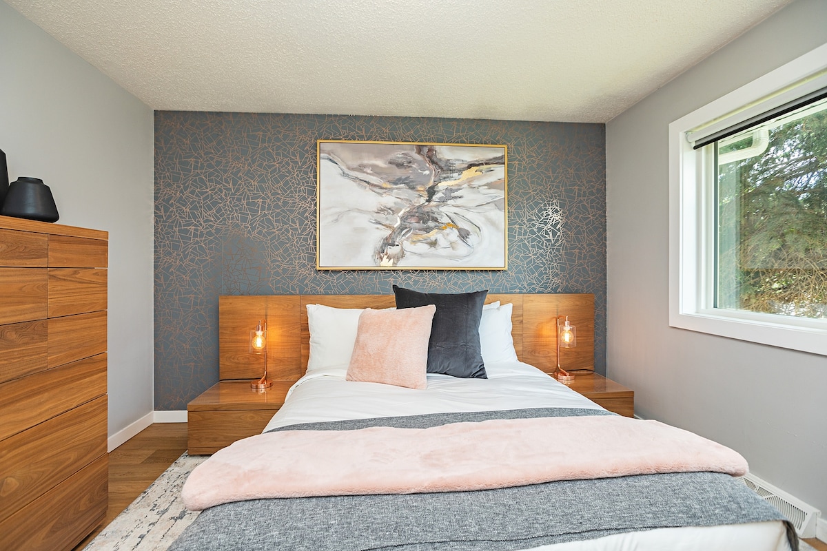 Welcome to our NEWLY RENOVATED 5-bedroom, 2-bathroom home, 2 minutes drive or 5 minute walk from West Edmonton Mall. Only minutes away from the city's famous attractions, and easy access to Edmonton's highways. This is the perfect location for those looking for a getaway from home. Air conditioned for the summer Private driveway parking Self-check-in/out with smart lock Enjoy streaming services and cable High-speed wi-fi Professionally cleaned and sanitized