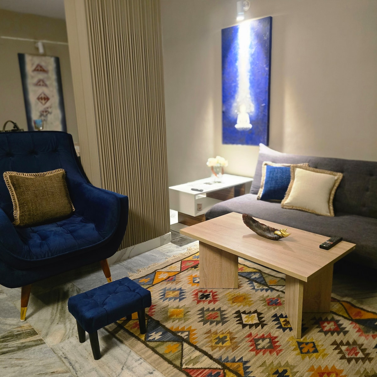Experience our brand new, luxury 1-BHK apartment, ideal for couples and travellers seeking comfort and privacy in a central location. The bedroom has a king bed with soft orthopedic mattress for a restful night's sleep. Relax in the cozy living room with a 43-inch Smart TV, lightning-fast WiFi and a dedicated dining area. Comes with a super clean bathroom stocked with bath essentials. The fully equipped kitchen includes high-quality appliances and crockery for your culinary adventures!