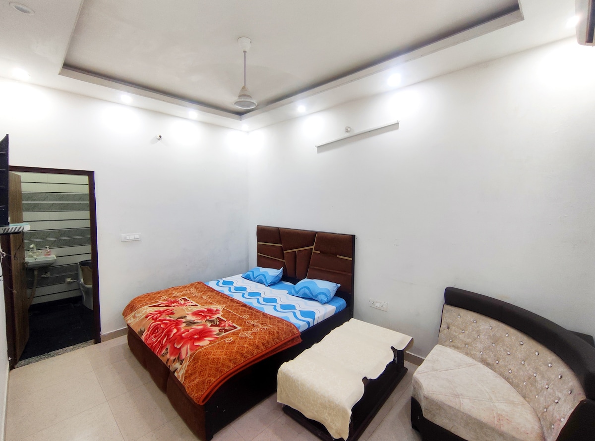Comfortable and clean room near Prem Mandir and ISKCON Temple Vrindavan, both at walking distance. The room has a double bed, attached bathroom with hot water, AC, and free parking. Peaceful and safe location, perfect for devotees and families visiting Vrindavan.
