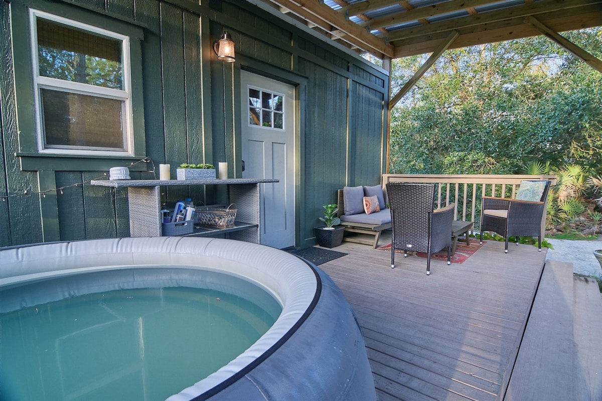 Welcome to our newly spacious and private renovated bathroom with our outdoor shower. See photos! This Tiny House has all you need for a cozy, private stay while visiting St. Augustine. The Tiny House sits on 3/4 acres. You will feel the tranquility of this magical property and only 10 minutes to Vilano Beach or the Historic Downtown. The studio is equipped with a sink, toilet, kitchenette, coffee/tea. Commune with nature in your Private Exotic Outdoor Shower, hottub (closed July & August).