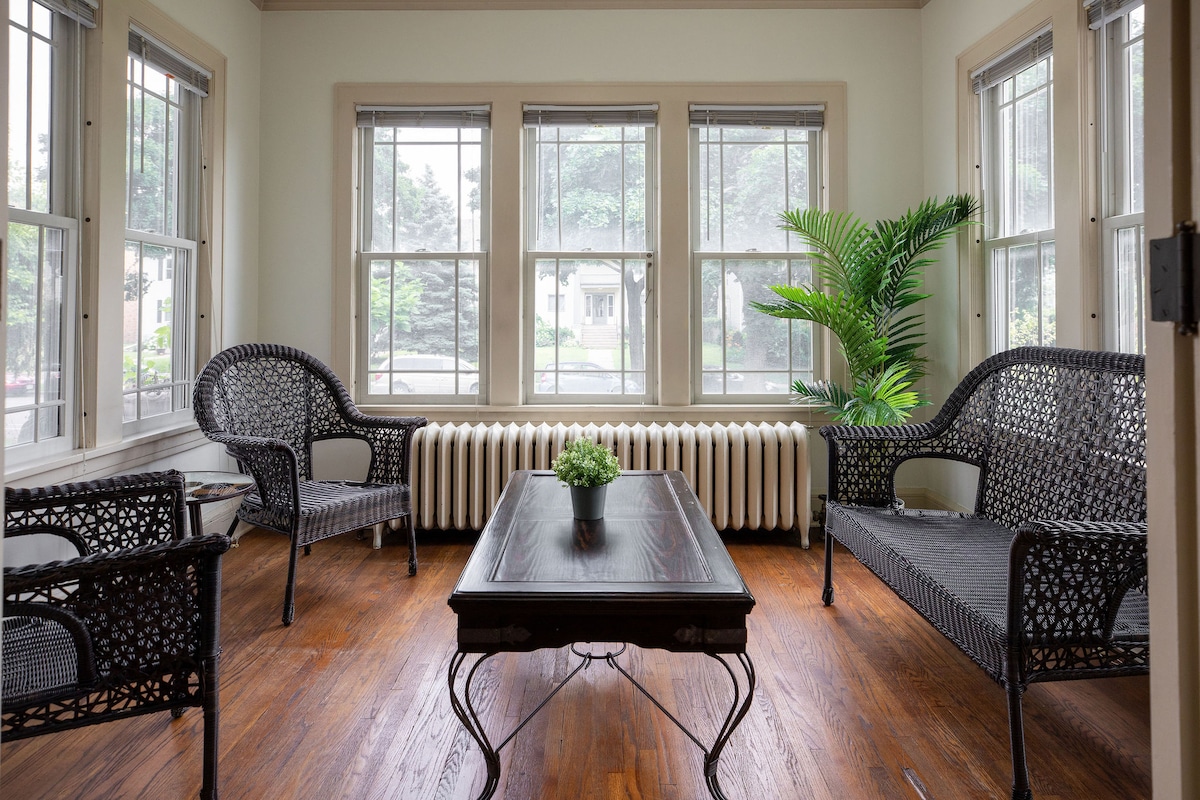 세인트 폴 최고의 아침 식사, 빈티지 상점, 양조장, 디너 클럽, 콘서트, 박물관이 있는 어바인 파크, 웨스트 세븐스에서 몇 걸음 거리에 있는 이 펑키하고 예쁜 다운타운 세인트 폴 1890 빅토리아 양식의 저택으로 오세요. 1960년대 할리우드 리젠시 (Hollywood Regency), 1970년대 빅토리아나 (Victoriana), 1980년대 포스트모던 스타일의 가구로 꾸며진 현대식 가구로 꾸며져 있습니다. 관광객이든 주말 휴양지이든, 이 아늑한 도시 휴양지에는 누구나 즐길 수 있습니다.
