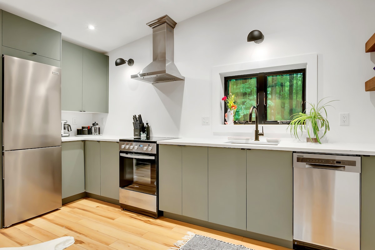 러블리 라인벡 게스트하우스에는 킹사이즈 메모리폼 침대가 있는 대형 침실, 피아노가 있는 대형 거실/식사 공간, 욕실, 주방이 있습니다. 창문과 빛이 많고, 일몰에 연못이 내려다보이거나 아침에 커피/차를 즐길 수 있는 완벽한 데크가 있습니다. 숙소는 아름다운 75에이커 버거힐 공원에 인접해 있으며, 라인벡 빌리지까지 모두 5분 거리에 있습니다! 킹스턴까지 20분, 밀브룩까지 30분, 허드슨까지 40분 거리입니다. 주방에는 조리 냄비/팬/칼 등 용품이 완비되어 있습니다.