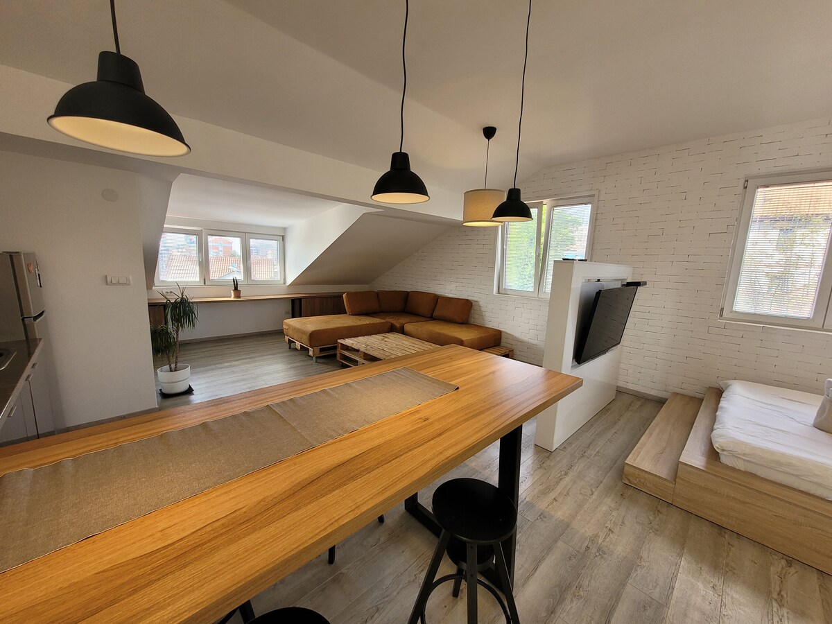 Situated in a ex shopping mal now "Design district of Belgrade", in a strict center of Belgrade, the place has a kitchen, toilet and a shower on a lower part and sleeping room on a top of the apartment. SO: this place WAS a hostel but now it is apartment, and if you book it you will be staying alone (NO SHARED parts of it). PLEASE NOTE: as the place is in the strict center of Belgrade, and some clubs are near, NOISE can be heard! You might need earplugs on some nights, very likely on weekends!