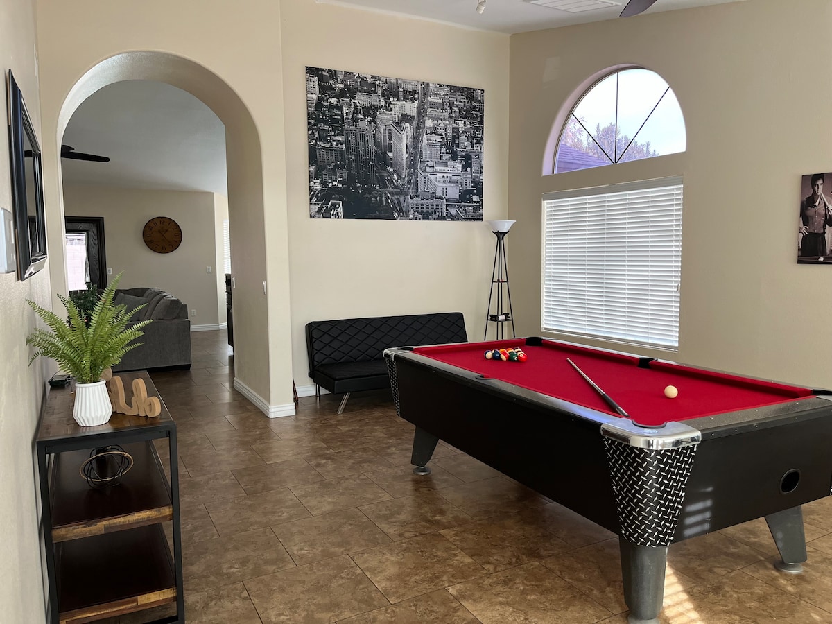 🏊 온수 해수 수영장과 스파에서 연중 내내 휴식을 취하세요(피부/눈에 자극이 적음) 🔥 아늑한 화재 기능 🍳 완비된 주방 + 야외 프로판 바비큐 그릴 🎱 당구대, 푸즈볼, 다트, 대형 TV가 있는 게임룸 🌞 애리조나 날씨를 즐길 수 있는 야외 식사 공간 및 바 📺 스파에 몸을 담그고 게임/영화를 즐길 수 있는 야외 TV 🚗 주요 고속도로 2개로 쉽게 이동할 수 있습니다. 🎨 예술적이고 독특하게 꾸며진 숙소 피닉스의 리조트 같은 휴양지(글렌데일 우편물) – 가족, 골프 여행 및 휴가에 적합