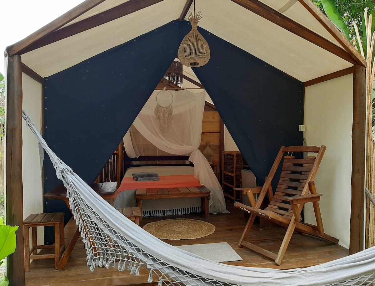 A 50 metros do mar, aproveite a experiência de uma hospedagem super autêntica e confortável - dormir numa tenda linda, ouvindo o barulhinho do mar e dos pássaros, com todo conforto necessário para suas férias serem diferentes e inesquecíveis. Suíte com ar condicionado, frigobar, mosquiteiro, roupas de cama e banho, varanda com espreguiçadeira e mesinha, espaço privativo e muita autenticidade, em frente a um jardim super gostoso.