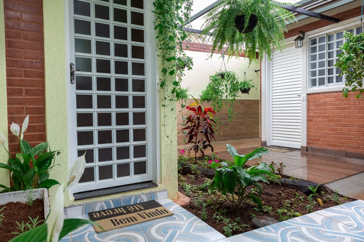 Espaco separado da casa, com banheiro próprio, cozinha equipada com louça, cafeteira, sanduicheira, fogão de 1 boca, microondas, frigobar, roupa de cama (lençol, virol, fronha, travesseiro e cobertor), toalha, internet, tv e ventilador. COM GARAGEM. Entrada pelo jardim com privacidade.Taxa extra de R$ 15,00 para acesso à máquina de lavar por lavada caso o hóspede queira lavar suas roupas pessoais. Horário de check in às 14 horas e check out às 11. Flexibilidade a combinar