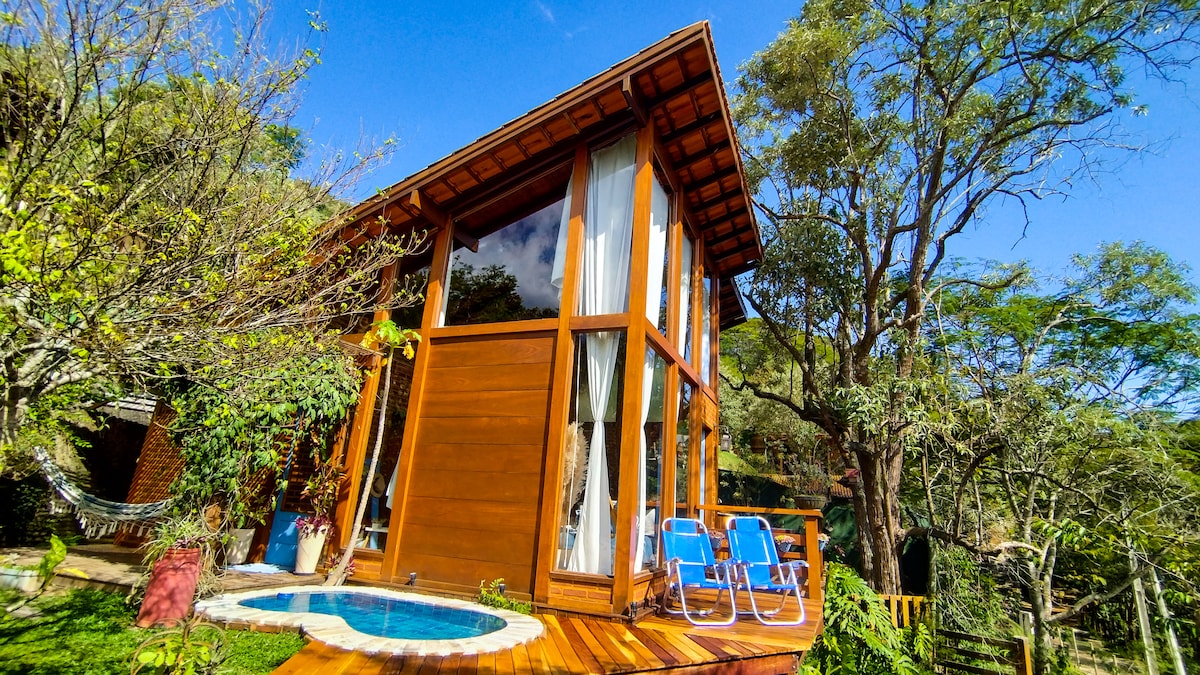 리우데자네이루 산에서 가장 매력적인 휴양지 중 하나인 아라라스에 위치한 매우 낭만적인 오두막입니다. 욕조, 수영장, 벽난로, 바닥 난로, 바비큐, 해먹... 천국 같은 곳에서 속도를 늦추고, 긴장을 풀고, 에너지를 충전할 수 있습니다. 울창한 자연으로 둘러싸여 숨막히는 전망과 평화로움이 가득합니다. 캐빈은 매력, 세련미, 편안함, 인상적인 건축물을 제공합니다. 독특한 경험을 하실 수 있도록 모든 디테일을 고려했습니다!