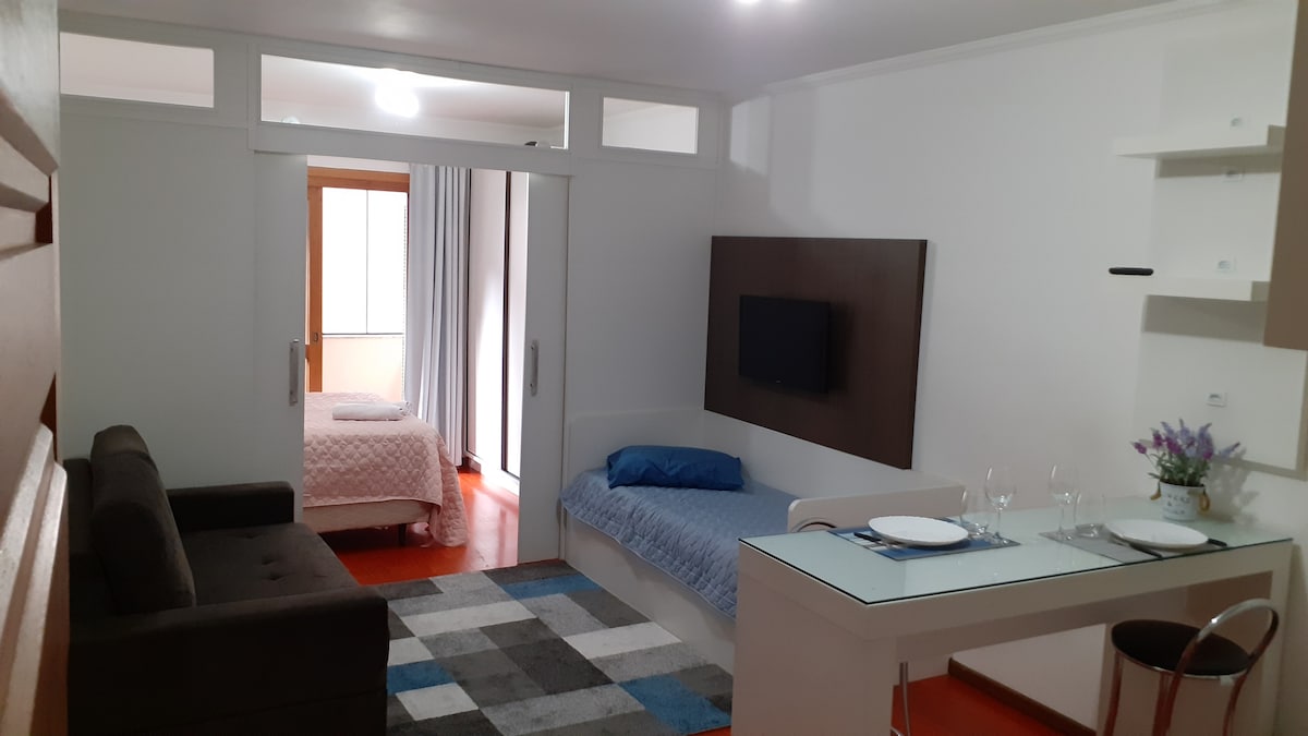 Viva momentos únicos na Serra Gaúcha! Hospede-se em um flat completo com a estrutura de um hotel e o conforto de casa. Lareira, piscina aquecida, sauna, brinquedoteca, academia e muito mais. Nosso flat está em local tranquilo, apenas 700 metros da Catedral de Pedra (cartão postal/centro de Canela). Fica em uma rua residencial arborizada, com fácil acesso a cafés, restaurantes e lojas. Ao lado área verde, contato com a natureza. Serviço de café da manhã (custo à parte) entregue no apto.