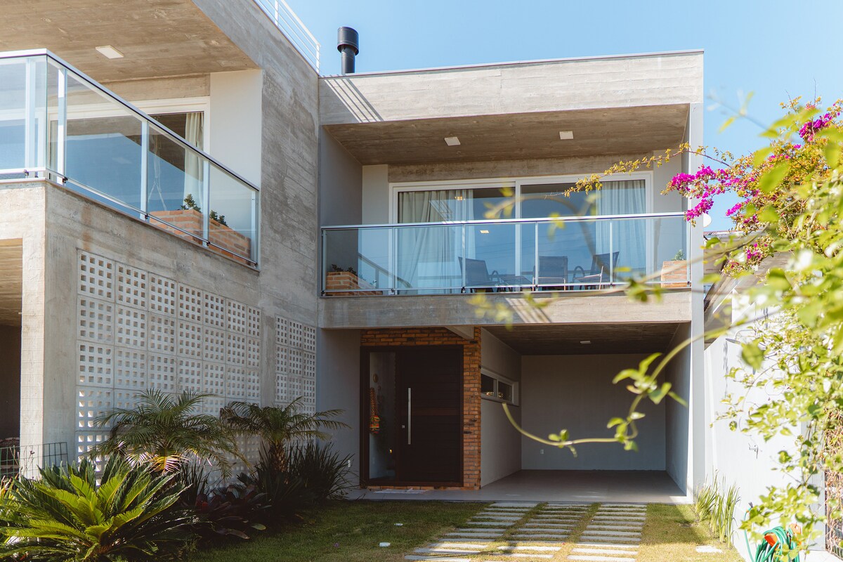 Em nosso espaço você encontra 3 sobrados, feitos com cuidado para receber quem busca conforto e descanso. A casa 1 tem vista para o jardim, fica 50m de distância do mar. Ela acomoda 6 pessoas e mais 2 extras. Tem 1 suíte e mais 2 quartos todos com ar condicionado. Temos os travesseiros e mantas. As duchas dos banheiros tem aquecimento solar. Cozinha completa com churrasqueira integrada, lavanderia, lareira externa, jardim, Wi-fi. 1 vaga de estacionamento.