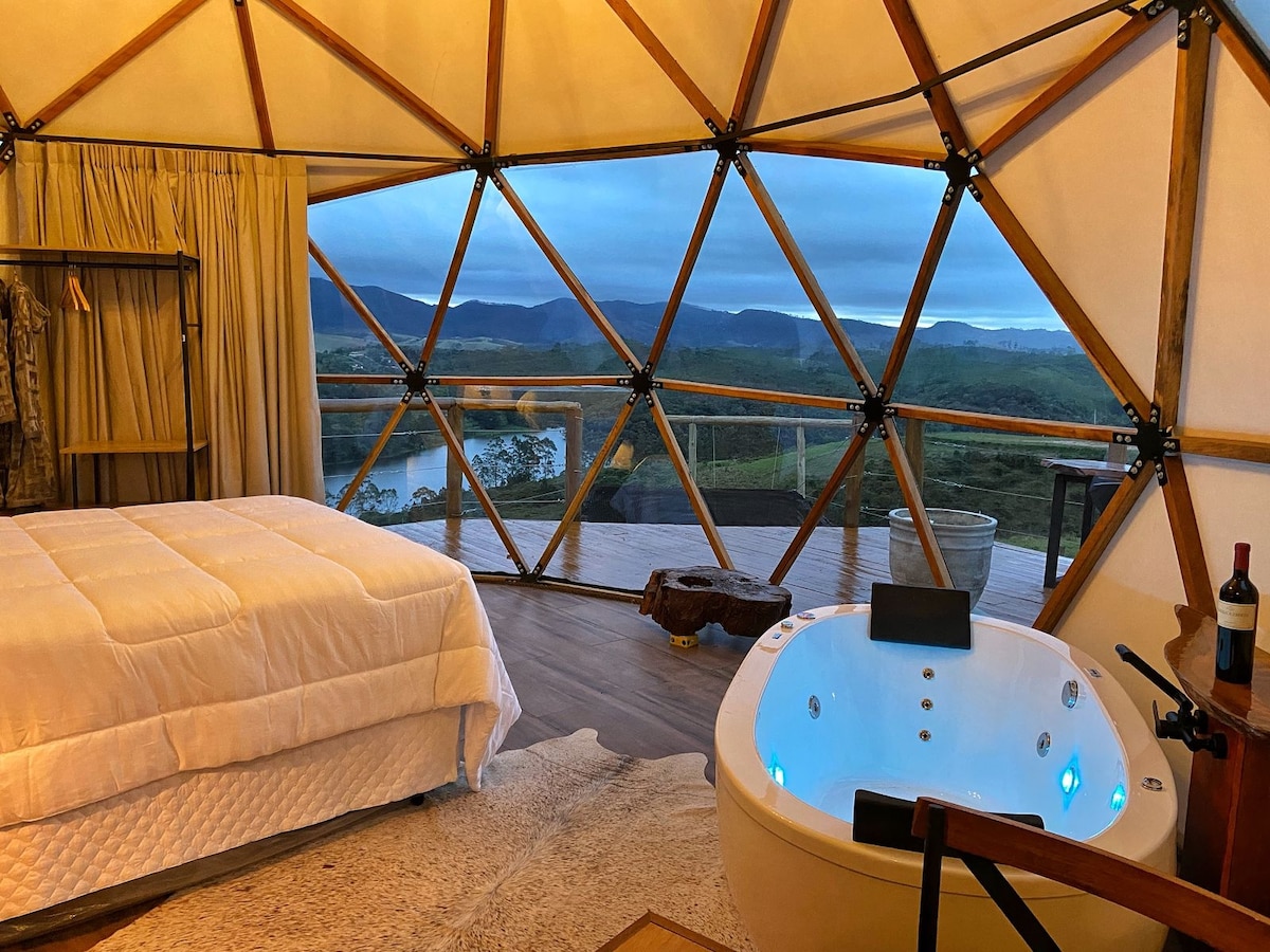 Bem vindo a este encantador Domo que foi cuidadosamente projetado para proporcionar um refúgio tranquilo e romântico para os seus ocupantes. Localizada em uma colina oferece vistas panorâmicas do lago e das montanhas. O Domo possui grandes janelas que convidam a luz natural a iluminar o ambiente. Decorado com tons suaves e elegantes, possui cama Queen-size luxuosa, com uma banheira de hidromassagem espaçosa e o amplo deck ao ar livre é o local perfeito para jantares românticos ao pôr do sol.