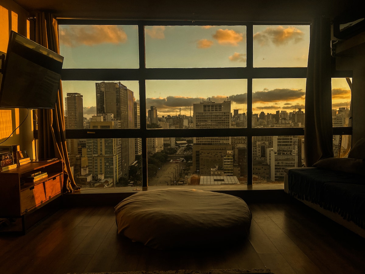 O studio fica no 31º andar do edifício mais alto do centro, com um design moderno e acolhedor, além de uma vista impressionante da cidade. Da janela, é possível admirar o Vale do Anhangabaú, Centro Histórico, as antenas da Av. Paulista: uma das paisagens mais belas de SP. É o prédio onde fica o SampaSky e é possível caminhar para as principais atrações do centro. Conta com ar condicionado, TV de 55'' com apps, cozinha equipada com utensílios básicos, cooktop (1 boca), microondas e frigobar.