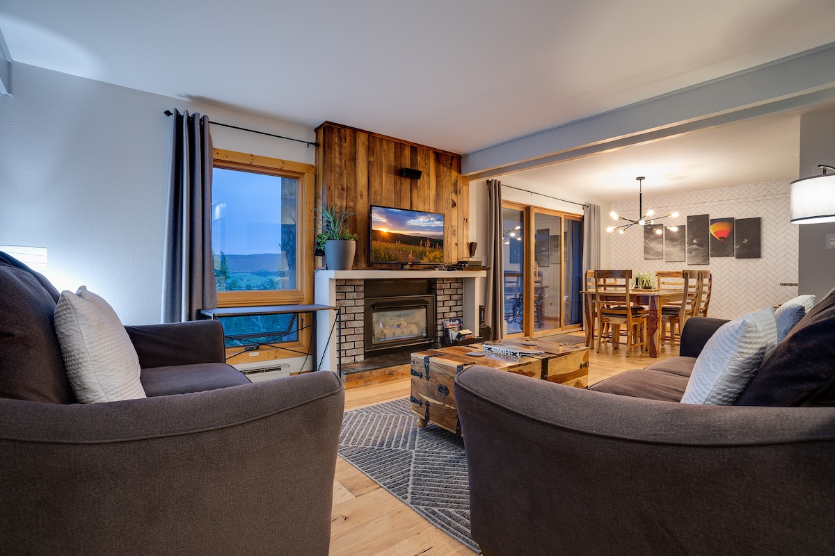 새로 리모델링한 이 넓은 콘도는 모든 것에 가깝습니다. 여름에는 전기자전거 4대를 대여할 수 있습니다! MTN, 레스토랑, 작은 식료품점, 양조장 등이 도보로 단 2분 거리에 있으며, 식료품 쇼핑까지 차로 5분, 도심 한가운데까지 차로 7분 거리에 있습니다. 무료 겨울 셔틀 + 버스 교통편. 가족이나 친구를 위한 완벽한 휴양지입니다. 특히 모험을 즐기고 싶다면 말이죠! 하이킹, 낚시, 강에서 수상, 자전거 타기, 스키/보드 타기 등! 연중 내내 스팀보트는 모든 것을 갖추고 있습니다!