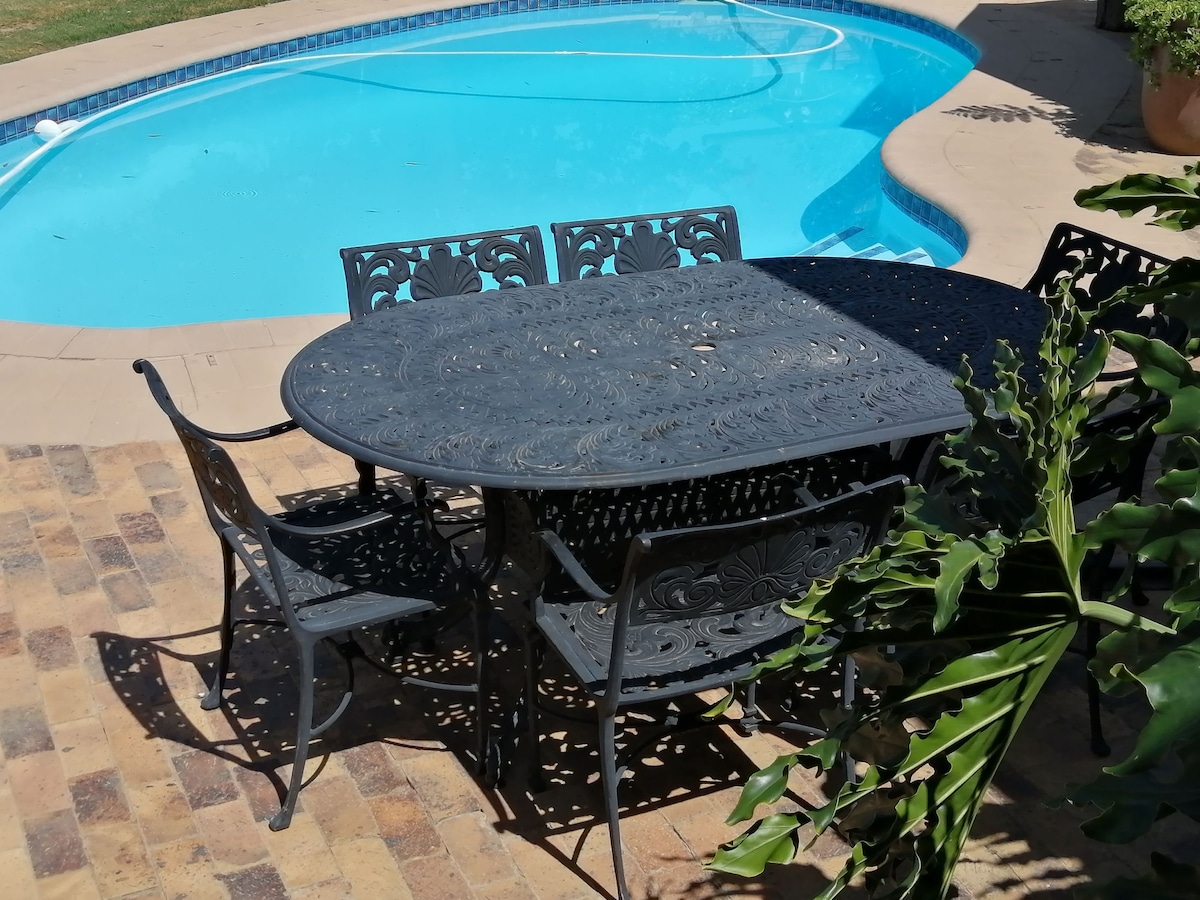 Kick back and relax in this modern Studio apartment for 2 people, with remote access, allocated parking for 1 vehicle, private outside area and use of the communal swimming pool. Situated in a quiet neighbourhood with 2 parks and ample birdlife, within walking distance from Middelvlei Wine Farm and Restaurant, next to Devon Valley Road that leads to several winefarms ending at JC le Roux Sparkling Wines. 3km from centre town. Nala, our doggy will welcome you and keep you company.