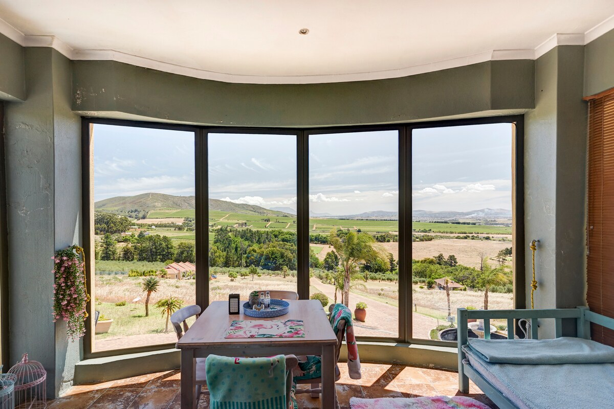 A beautiful open plan guest apartment in the Winelands.It has magnificent views ,is beautifully furnished and is quiet and peaceful.There is a kitchenette( microwave,no oven)en suite bathroom( shower only)dining area and balcony.It’s airy & light.Guests are able to walk on the farm to stretch their legs and take in the beautiful views and fresh air or watch the zebras,springbok and wildebeest in the game camp. It is Located 7 km from the town center of Stellenbosch