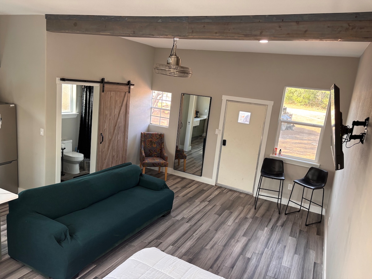 Our guests enjoy privacy of our bunkhouse. Living rm/shower/toilet and lav are downstairs. One twin bed and a futon in 'standing room' loft. Queen bed in private bedroom. WIFY and Roku/Hulu. Breakfast fixings: coffee, tea, cereal bars, instant oatmeal, waffle/muffin mix. Microwave, toaster oven, ele. hot plate for cooking. Dorm size refrig/freezer. Several great local restaurants. 4 museums. Pet friendly! $10 for each additional adult, after 2. Approx 6 miles from Cuero and 25 from Victoria.