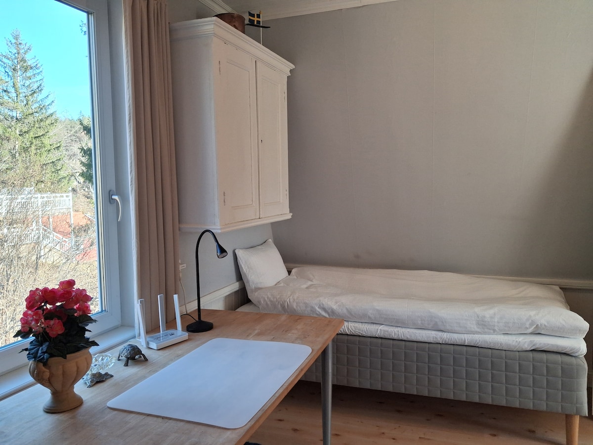 50㎡의 아파트, 1.5개의 방과 주방은 물론 전용 파티오와 정원을 갖추고 있습니다. 오래된 스타일로 개조되었습니다. 이 아파트는 빌라 1층에 위치해 있습니다. 여기서 스톡홀름을 발견할 수 있으며, 숙소에서 불과 300m 거리에 수영장이 있는 울창한 지역에 살고 있으며, 옆 숲의 하이킹 트레일도 즐길 수 있습니다. 무료 주차 또는 버스 + 통근 열차 또는 버스 + 지하철. (대중교통으로 시내까지 30~45분 소요.) 직접 청소하고 이불과 수건을 가져오세요. 대여 가능하며 직접 세탁하실 수 있습니다. 티비가 없다는 점을 참고하시기 바랍니다.