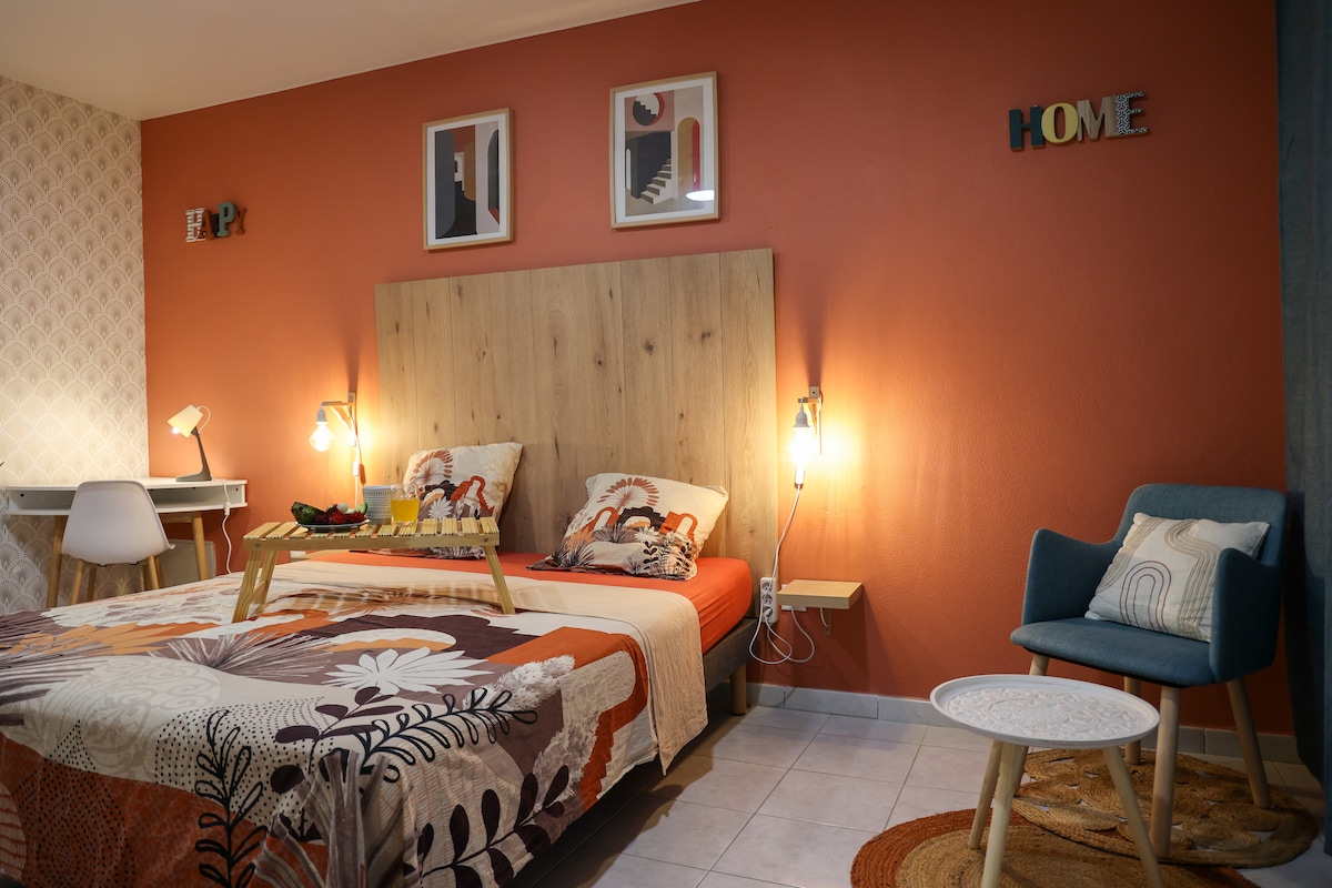 Escape for a while to a peaceful and charming setting, ideal for couples, nature lovers, or business travelers. Here's what you'll find in our Cozy Cocoon: • Private entrance, • 1 king-size bed and 1 sofa bed, • Close to amenities, • Zen garden, • Private, secluded parking, • 20 minutes from the airport. Additional services available: Romantic, birthday or surprise decorations (balloons, LED candles, petals…): 120€
