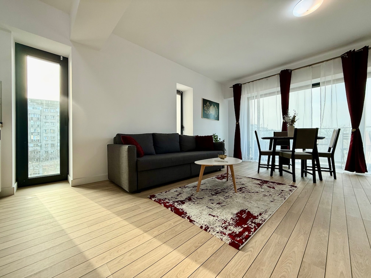 Unwind into our modern and newly built apartment in vibrant Bucharest, perfect for up to 4 guests. Enjoy a stylish living and dining area, cozy bedroom, full kitchen, AC, fast WiFi, a luxurious bathroom with bathtub and Klaus parking system โ maximum car height: 1.5m. The private balcony offers sweeping viewsโideal for unwinding in comfort.
