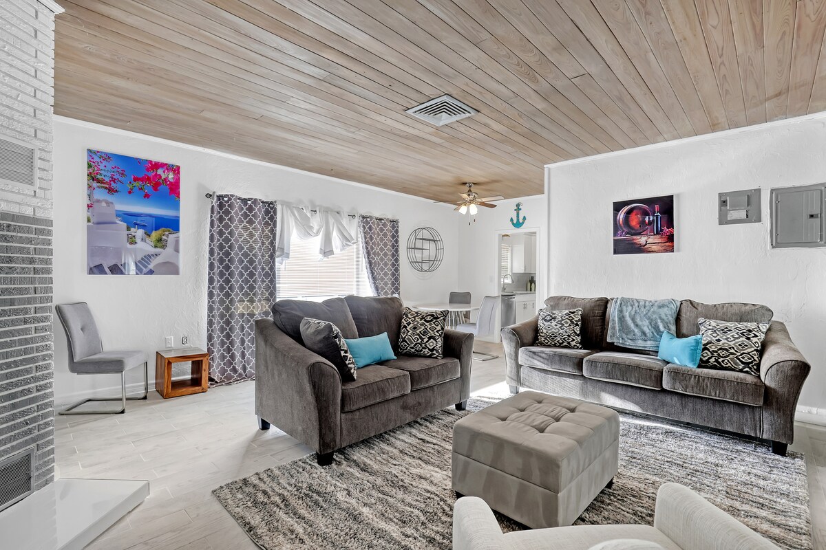 Relax with friends and family at our cheerful fun filled house. The house features two bedrooms (one king and one full mattress), one bathroom with a rain shower, a multipurpose room ( office/gaming) screened and covered patio with grill, exterior patio, fire pit and a dog cabana play area. This house is minutes from a grocery, gas and good eats. Another 10-12 minutes away you have a downtown shopping area and beautiful Florida beaches.