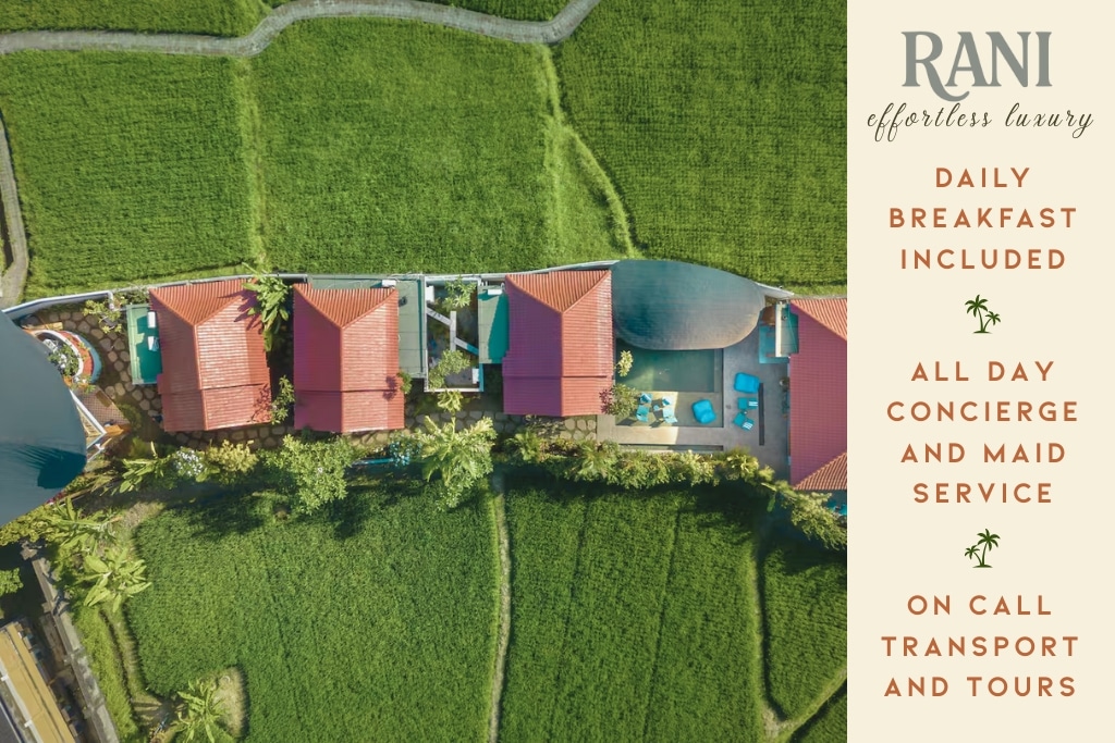 Delicious complimentary breakfast. Personal maid & concierge service onsite. Trusted drivers on-call, floating breakfasts, massages, private yoga & more - all at great rates. Enjoy luxurious private suites, movie nights in a floating cinema under the stars or sunset cocktails on the bamboo roof terrace. Villa Rani blends the soul of traditional Balinese architecture with five-star modern comfort, moments from Ubud centre. From airport pick-up to drop-off, we’re ready to spoil you in paradise.