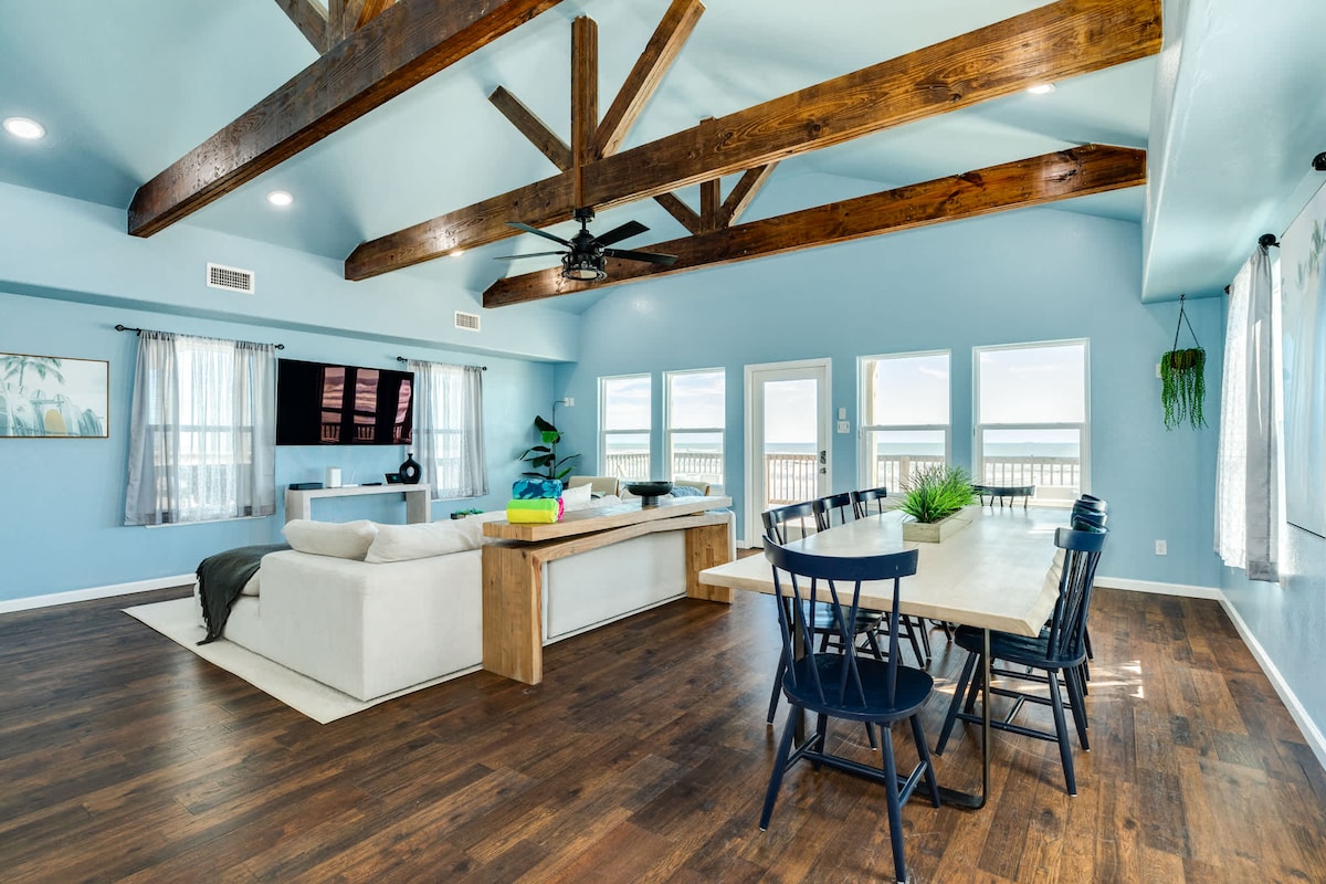 🏖 Designer beach house steps from Surfside Beach! Sleeps 14 with themed rooms, shuffleboard, Infinity Game Table, wave mural, decks with water views, firepit, ping pong, fenced yard, and pet-friendly setup. A fun, personality-packed stay just an hour from Houston.