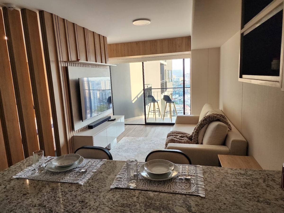 Wake up to open skyline views just half a block from Kennedy Park, in the heart of Miraflores. This luminous boutique loft is ideal for longer stays and remote work. Floor-to-ceiling windows throughout the apartment offer views over Av. Diagonal, the building’s garden courtyard, and the Miraflores skyline. Enjoy rooftop pool, gym, coworking, private parking, ultra-fast Wi-Fi, self check-in, and 24/7 reception—steps from cafés and Lima’s best dining.
