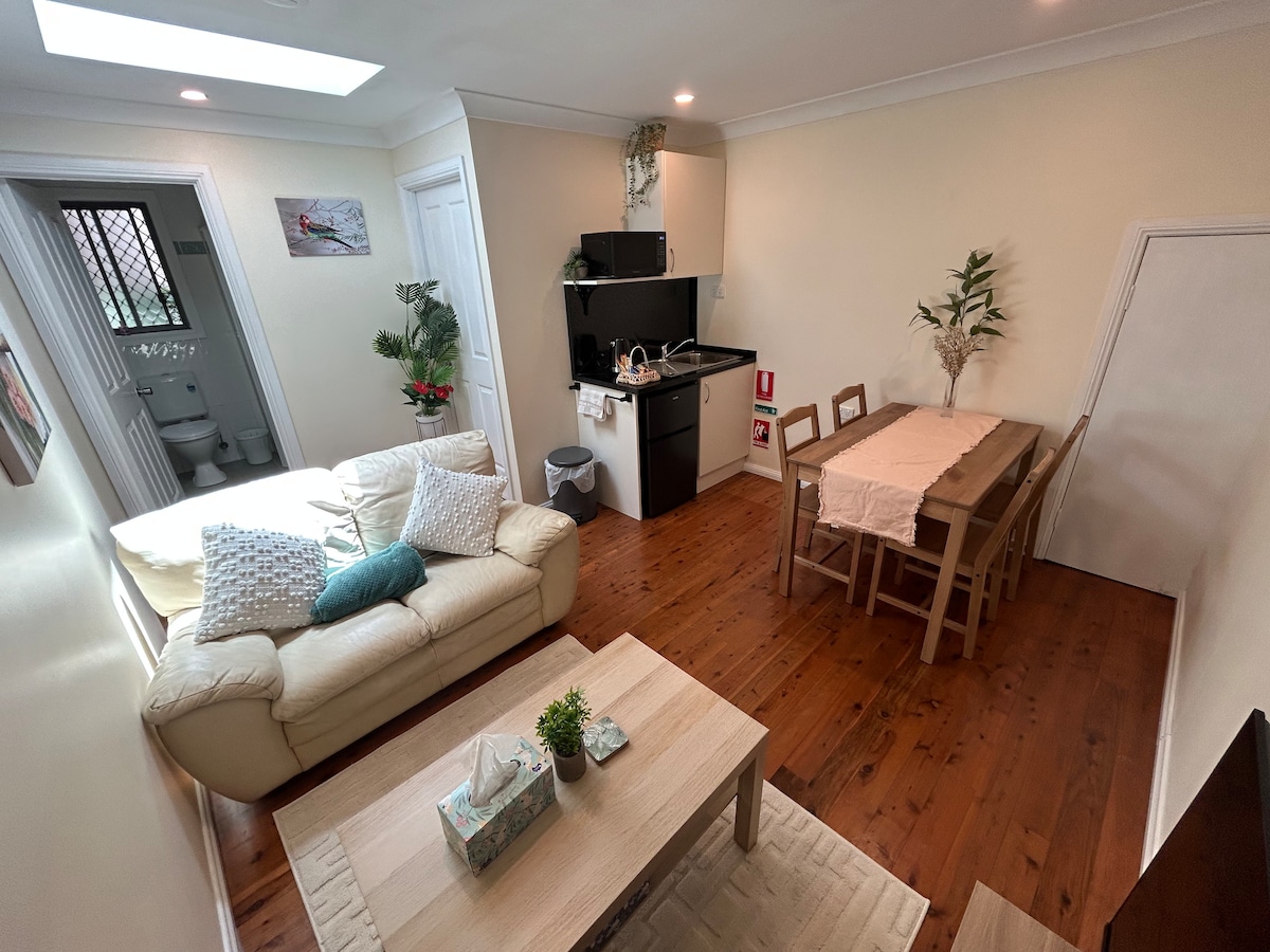 에어컨을 갖춘 환상적인 전용 스튜디오 아파트! 원하는 대로 드나들 수 있는 전용 출입구. 장기 또는 단기 숙박에 편안한 더블 침대를 갖춘 넓은 객실입니다. 스마트 TV. 커피를 즐길 수 있는 전용 데크. 지붕이 있는 야외 공간과 데크. 완비된 주방, 식기세척기, 세탁기 로프터스 기차역은 도보로 7분 거리에 있어 시드니 당일 여행과 남부 해안을 쉽게 방문할 수 있습니다. 왕립 국립공원과 크로눌라 해변에서 가깝습니다. 나만의 휴양지처럼 느껴보세요!