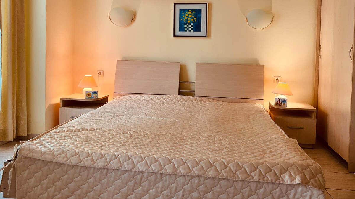 실용적이고 멋진 아파트. 침실 1개, 거실, 주방, 욕실. 침실에는 더블 침대 1개, 나이트 스탠드, 옷장이 있습니다. 거실에는 2인용 공간이 있는 멋진 수면용 소파, 위에 엑스트라 매트리스, 의자도 있습니다. 해변까지 100m. 햇살 가득한 해변 센트럼 바로 바깥의 멋진 지역. 시설에는 보안 및 리셉션이 있습니다. 대형 수영장 2개와 어린이 수영장 1개. 가족 여행에 딱 맞는 숙소. 같은 건물에 아파트도 4개 더 있습니다. 와이파이 및 구글 TV