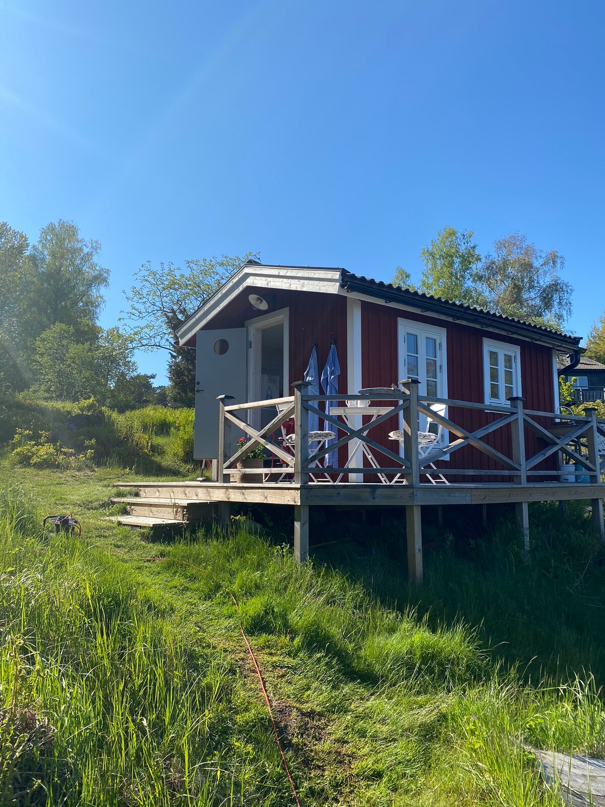 온종일 햇살이 빛나고 숙소에서 호수 전망을 즐길 수 있는 환상적인 호수 부지에 위치한 55평방미터의 숙소로 저희 대지의 일부에 위치해 있습니다. 사우나, 목욕 부두, 모래 해변, 잔디밭이 있습니다. 겨울에는 수영을 위해 얼음 싱크대를 뚫습니다. 거실에 식탁, 소파 그룹, 벽난로가 있습니다. 식기세척기, 전자레인지, 오븐, 냉장고, 냉동고 등 시설이 잘 갖춰진 주방. 180cm 침대가 있는 침실. 샤워기와 변기가 있는 욕실. 세탁기 및 건조기. 스톡홀름 시티 25km