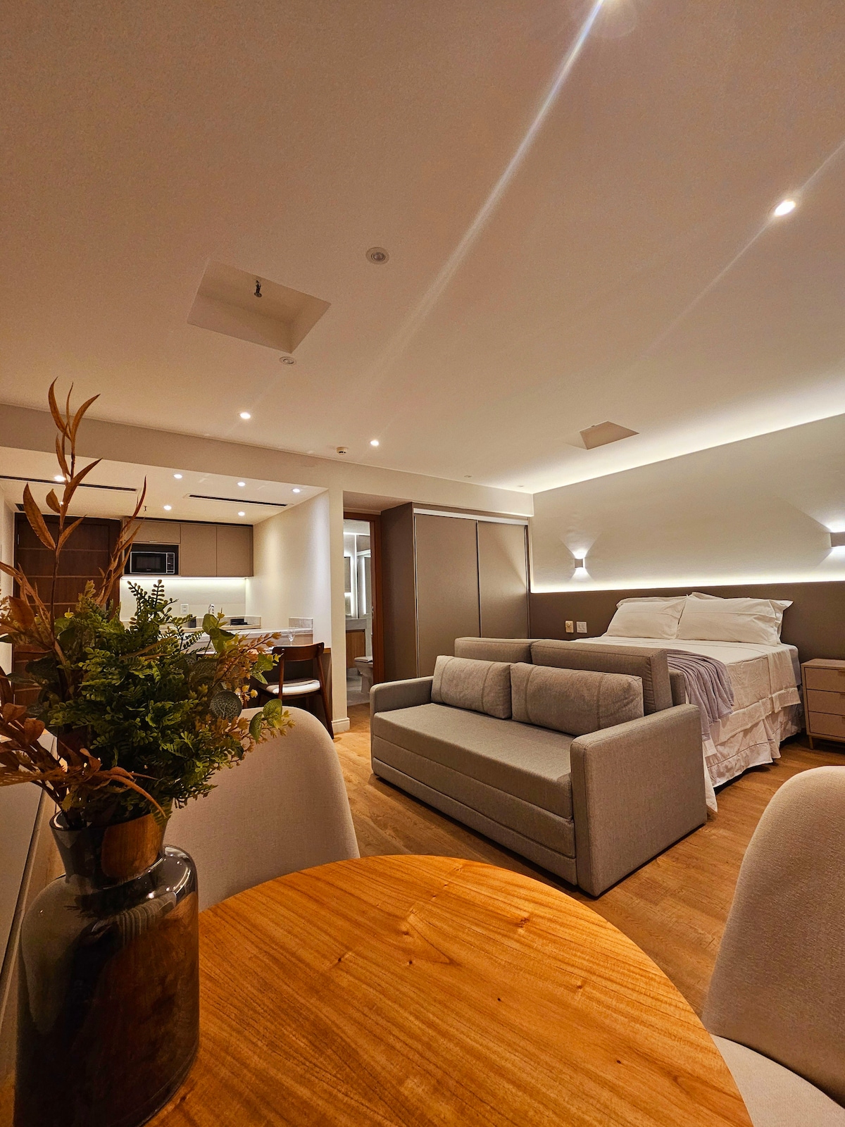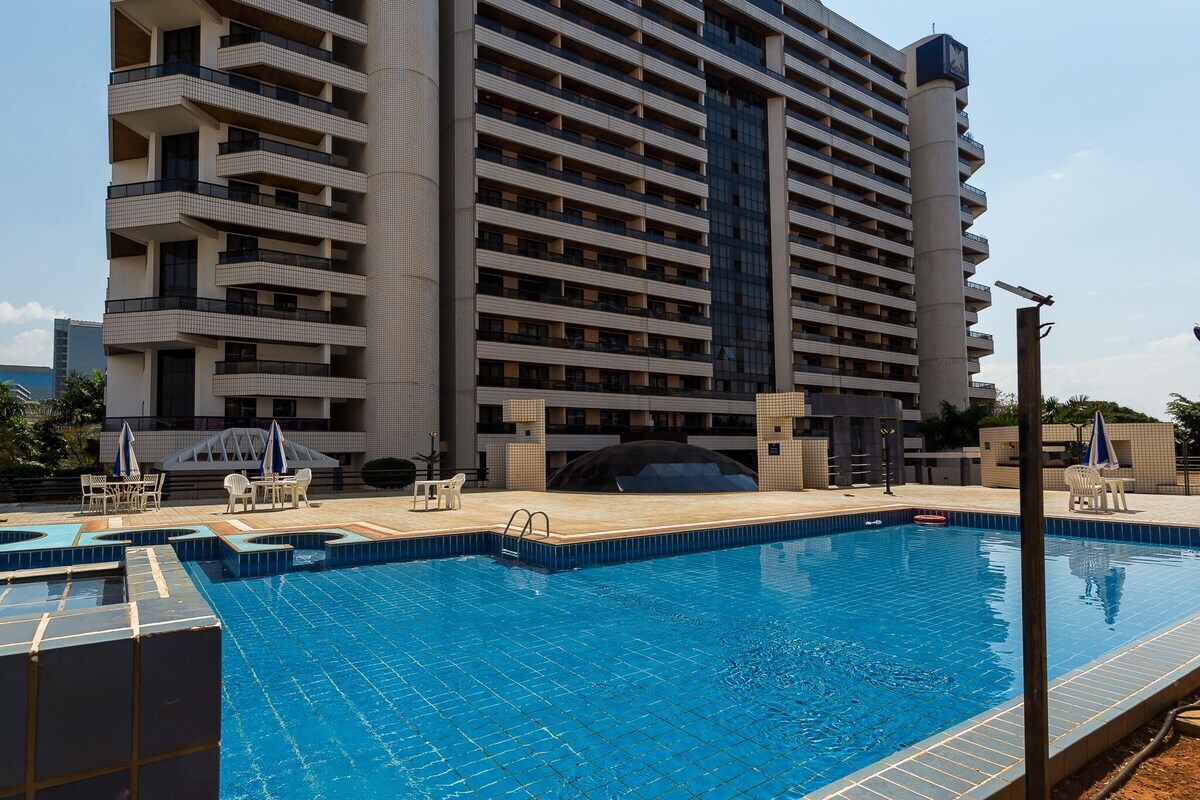 Belo flat no Garvey Park Hotel. 1 cama de casal e 1 cama de solteiro, banheiro, smart tv, geladeira, micro-ondas, ar condicionado, enxoval completo e wi-fi. Localizado no centro de Brasília, a poucos metros de restaurantes e shoppings. Curta distância da Esplanada dos Ministérios e demais pontos turísticos da cidade. Prédio entrou recentemente em reformas e a piscina está fechada.